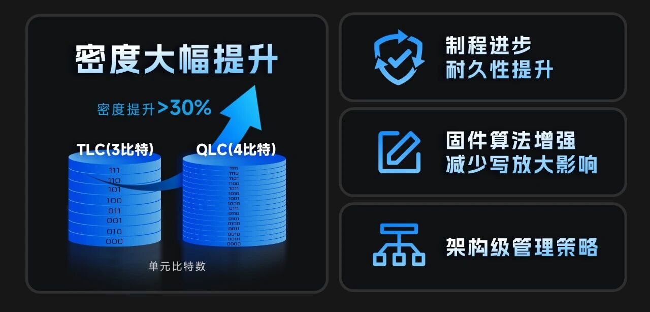 首先,NAND 架構的成熟迭代與 AI 數據結構變化的疊加效應:QLC 以單元四比特方式顯著提升晶圓利用率,相比 TLC 密度提升超過三成,而過去限制其進入企業級的耐久性、性能與寫入放大等問題,隨著制程進步、固件算法增強和架構級管理策略完善,已在大容量場景中逐步得到解決。