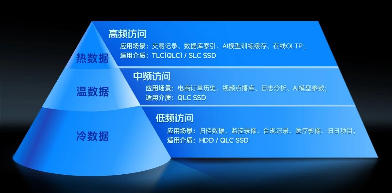 過去十年,企業級 SSD 基本以 TLC 介質為核心。TLC 在性能、耐久性和成本之間取得平衡,是當時大多數通用工作負載的最佳方案。但 AI 時代的數據結構發生改變,使得 純 TLC 方案逐漸無法兼顧成本、容量與能效要求——尤其在溫數據和熱數據持續膨脹的背景下。行業在過去兩年形成共識:企業級存儲將從純 TLC 向 SLC/TLC + QLC 的分層架構快速過渡。